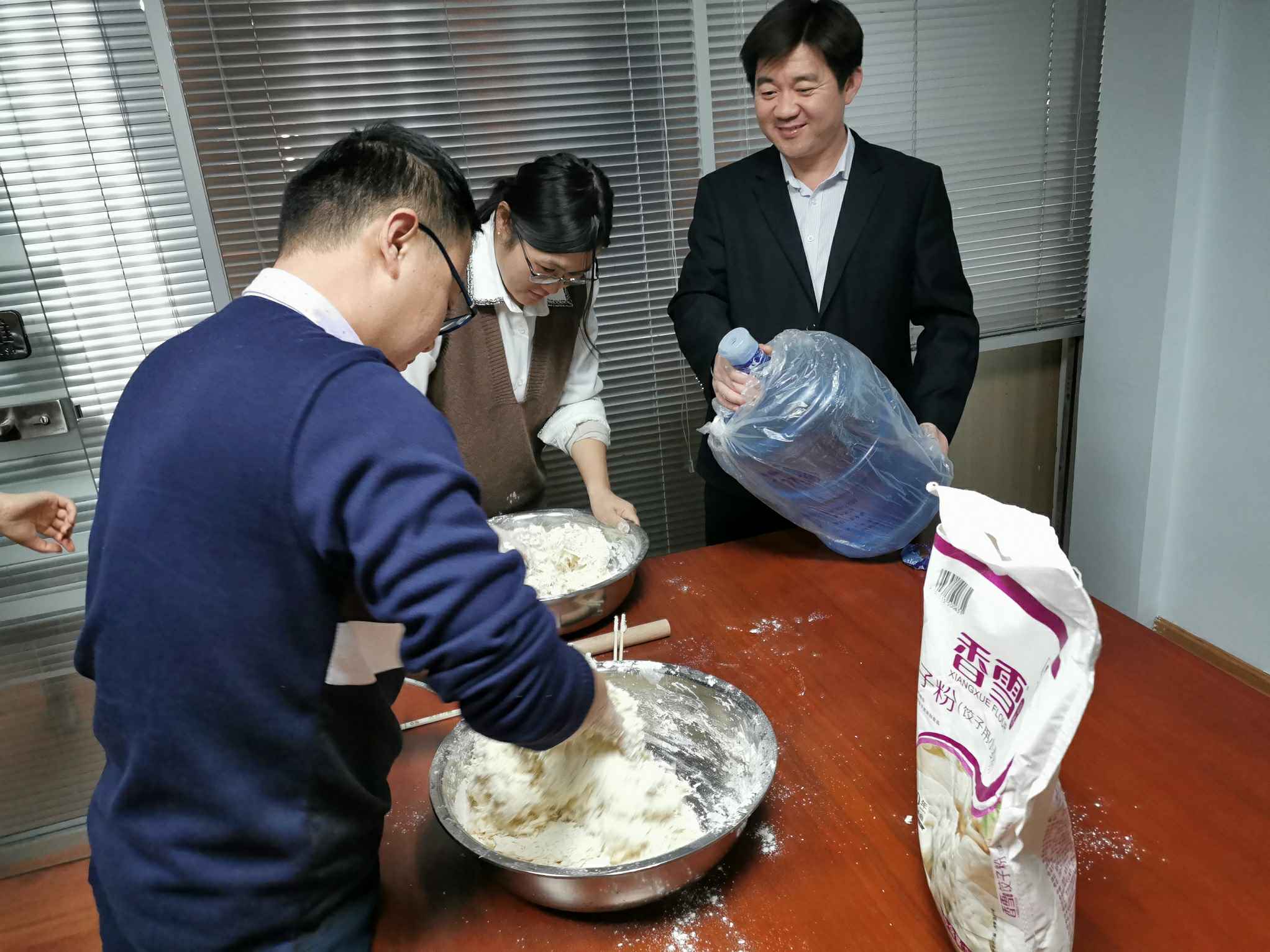大家在欢声笑语中开始包饺子,和面,洗菜切菜,调馅,烧水,大家默契配合、互帮互助。